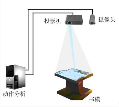 投影機(jī)將畫面投射到一本書的模型上,觀眾能看到一本書打開的樣子。通過兩個(gè)按鈕,觀眾可以選擇書的內(nèi)容,書的內(nèi)容及時(shí)通過投影機(jī)投射出來,觀眾站在書模型前做揮手動(dòng)作時(shí),翻書感應(yīng)器檢測出揮手的方向,計(jì)算機(jī)立即控制圖書翻頁,既可以向前翻也可以后翻,翻頁的同時(shí)可伴隨音效。