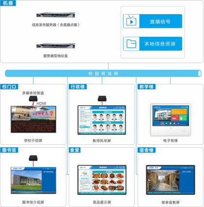 校園信息發(fā)布系統(tǒng)以前瞻性、教育性、 先進(jìn)性、實用性、易用性為設(shè)計思路,采取集中控制、統(tǒng)一管理的方式將音視頻信號、圖片 和滾動字幕等多媒體信息通過網(wǎng)絡(luò)平臺傳輸?shù)斤@示終端,以高清數(shù)字信號播出,可在學(xué)校的 大門、教學(xué)樓、行政樓、學(xué)校院區(qū)、會議室、圖書館、宿舍、食堂等位置設(shè)立數(shù)字媒體播放 器,連接各種顯示設(shè)備,如液晶電視、液晶顯示器、等離子電視、LED屏等,發(fā)布學(xué)校介紹、 信息公告、課程安排、天氣預(yù)報、會議通知、新聞等各種類型的多媒體信息,并可以同屏幕 組合播放多個節(jié)目內(nèi)容。從而明顯提高校區(qū)管理和服務(wù)水平,提升學(xué)校的社會競爭力和知名度。